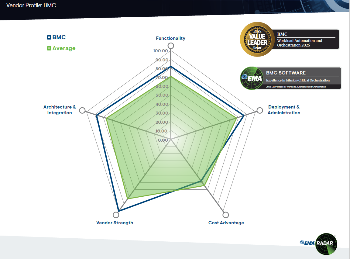 BMC has been named the overall highest performer and a Value Leader in the 2025 EMA Radar for Workload Automation and Orchestration—for the eighth consecutive time. Control-M also earned EMA's recognition for Excellence in Mission-Critical Orchestration, reinforcing its standing as the market leader for enterprise-class orchestration. For organizations evaluating workload automation platforms, this recognition reflects Control-M's maturity, breadth, and forward-looking platform strategy.