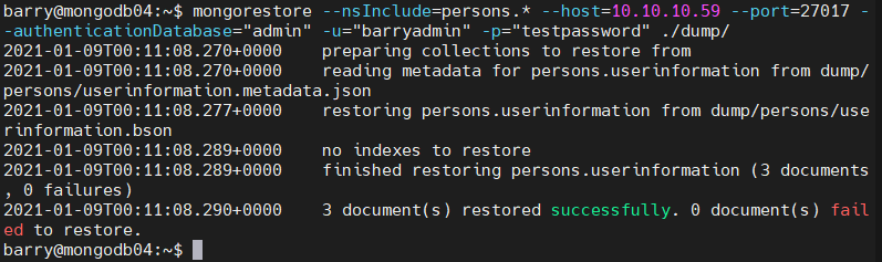 mongorestore --host=10.10.10.59 --port=27017 --authenticationDatabase="admin" -u="barryadmin" -p="testpassword" ./dump/