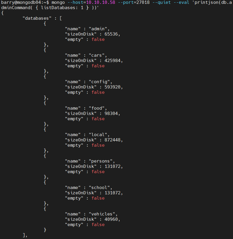 mongo --host=10.10.10.58 --port=27018 --quiet --eval 'printjson(db.adminCommand( { listDatabases: 1 } ))'