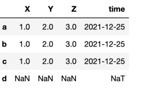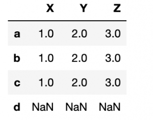 Now reindex this array adding an index d. Since d has no value it is filled with NaN.