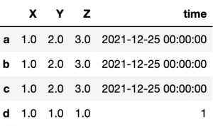 Here we can fill NaN values with the integer 1 using fillna(1). The date column is not changed since the integer 1 is not a date.