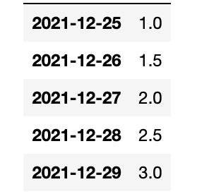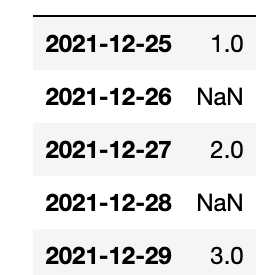 Consider a time series—let’s say you’re monitoring some machine and on certain days it fails to report. Below it reports on Christmas and every other day that week. Then we reindex the Pandas Series, creating gaps in our timeline.
